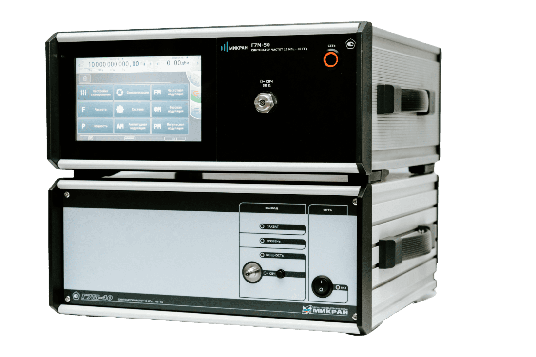 Синтезаторы частот серии Г7М позволяют формировать непрерывные гармонические сигналы с низким уровнем паразитных составляющих в диапазоне частот от 10 кГц до 50 ГГц. Установленные встроенные электромеханические ступенчатые аттенюаторы обеспечивают большой динамический диапазон регулировки уровня выходной мощности от -130 до +13 дБм. Ключевой особенностью данной серии является низкий уровень фазовых шумов выходного сигнала в высокочастотной области.